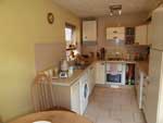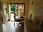 This is a neat room having a fitted kitchen and plenty of space for a dining table. The kitchen has dual aspect windows, one of which is a large French door that leads out into the south facing garden. The kitchen is equipped with an electric twin oven with gas hob above it and has a wall mounted gas boiler. There's a stainless steel sink and drainer with tiled splashback, space for a fridge, dishwasher and washing machine. The kitchen floor has ceramic tiles and there are fitted base level and wall cupboards, open shelves and drawers. There is a laminate marble effect work surface and plenty of power points. |
